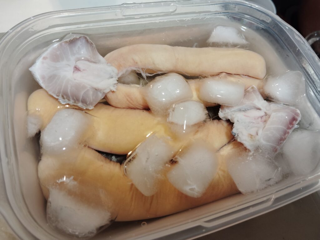 抜けきらない血が残っているため、氷水に浸して冷蔵庫で一晩寝かせます。