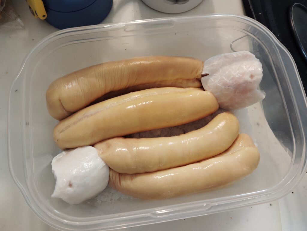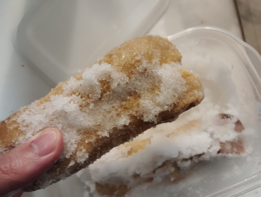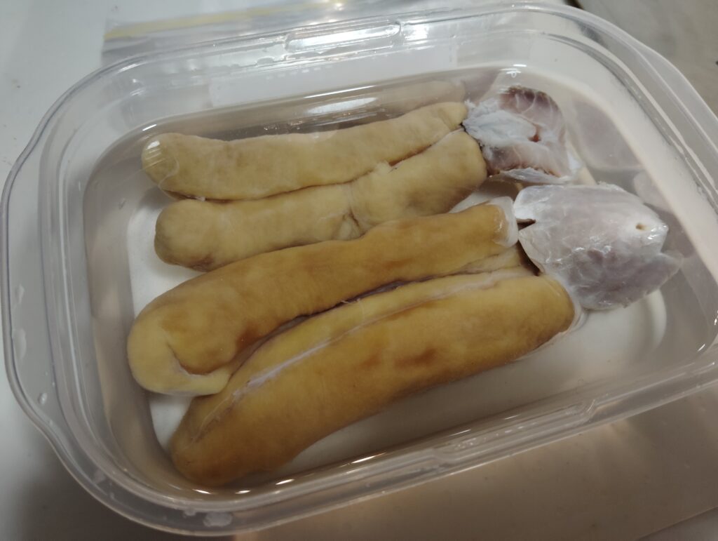 これで水分というか臭い部分は抜けましたが、塩味が強すぎるので薄い食塩水に半日ほど浸して塩抜きをします。