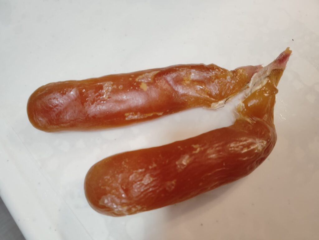 ↓干してから3日ほど経ったもの。いい感じに干されて、色もからすみっぽく濃くなってきました。
