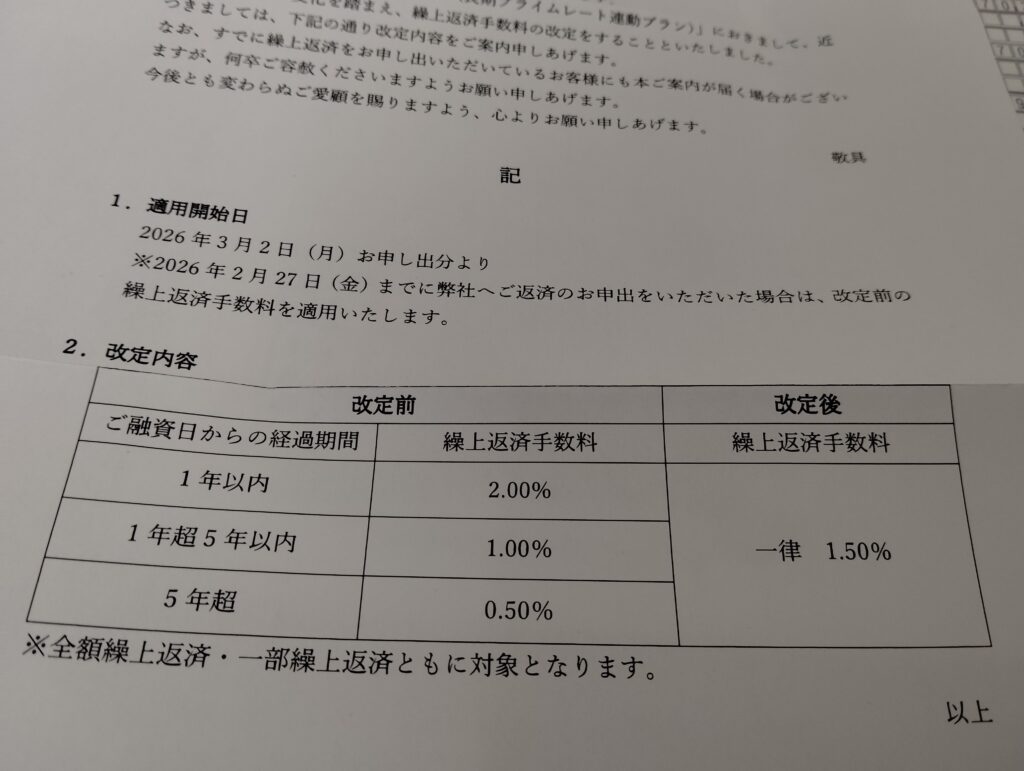 私の場合、当初借り入れから5年が過ぎてるので、現在の繰上返済手数料は返済額の0.5%なのですが、これが1.5%に上がるとのこと。3倍ですね。。