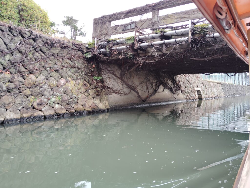 途中、5か所ほど橋の下をくぐるときに頭を低くして船の天井を下げなくては通れないところがあります。